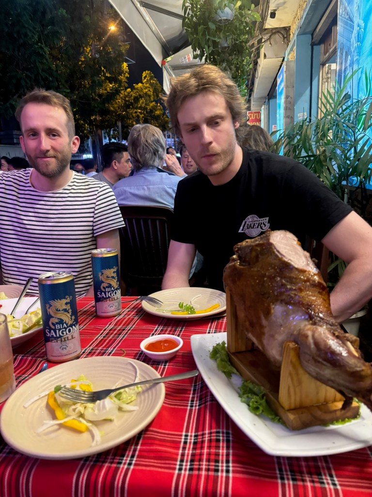 Il s’agit du repas du soir : un gigot d’agneau de 2,9kg à partager à cinq et accompagné de frites et salade. On n’est pas sur la grande tradition Vietnamienne mais c’est très bon, il n’y a pas de reste. Tony, pas au top de sa forme depuis le midi et incapable de manger quoi que ce soit, retourne se poser à l’hôtel.