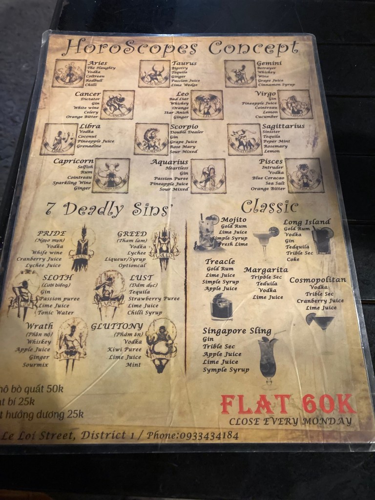 La carte propose des cocktails portant les noms de signes astrologiques, des sept péchés capitaux et d’autres cocktails plus classiques. Toute la carte est à 60.000 đ, soit moins de 2€ par verre.