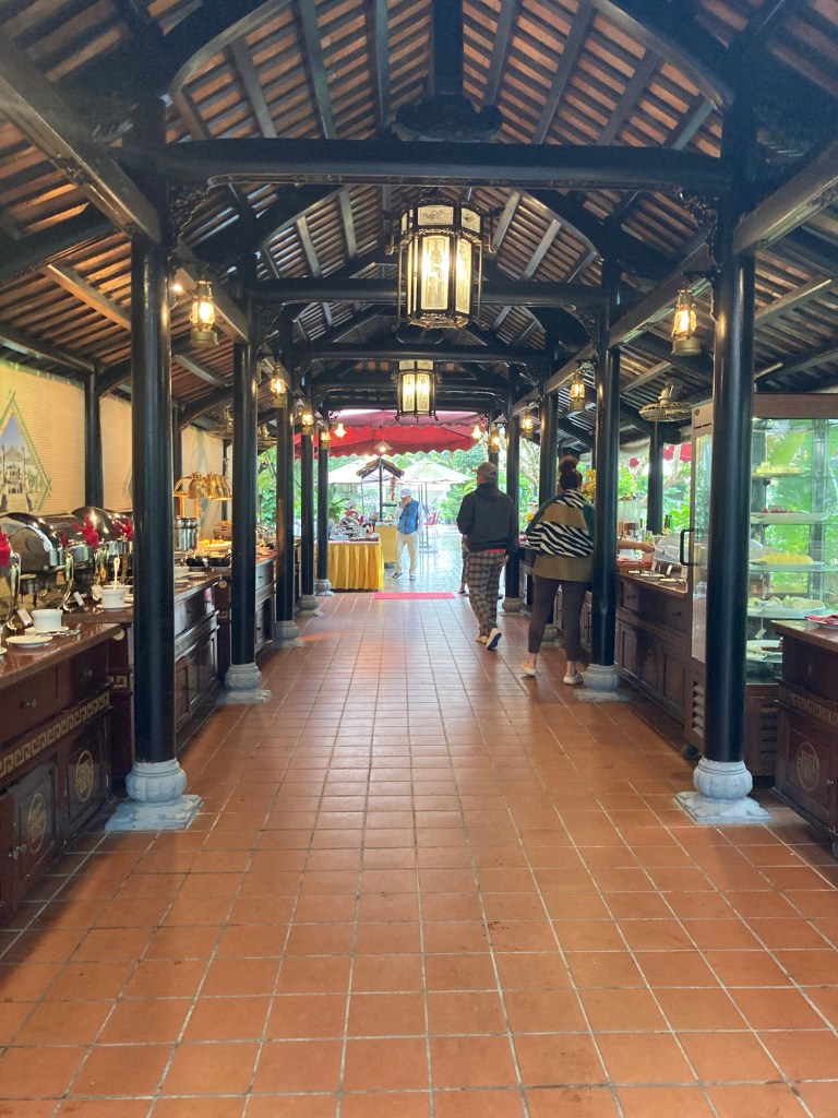 Nous choisissons une petite table abritĂ©e sous un prĂ©au pour rĂ©gler son compte au petit dĂ©jeuner. Il y a ici Ă la fois la version Viet et la version occidentale ; nâĂ©tant pas attirĂ© par les pho ce matin, jâopte pour du pain grillĂ©, du bacon et des petites viennoiseries.