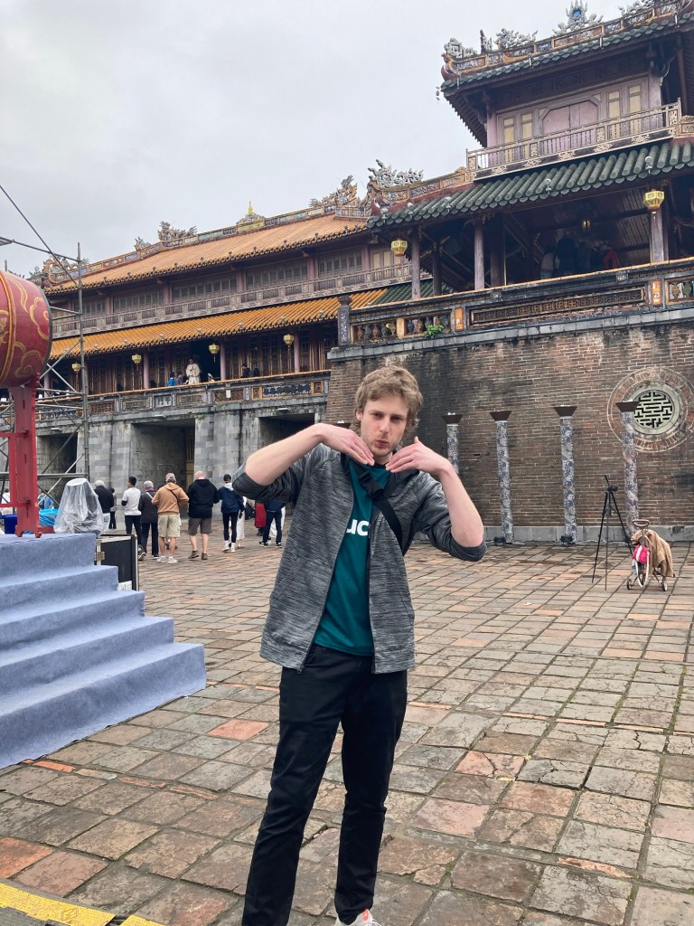 Le programme dâaujourdâhui est de visiter lâancien palais impĂ©rial puis de prendre un train touristique pour rejoindre ÄĂ Náș”ng, plus au sud. Le checkout Ă©tant Ă 12h00, et comme il est dĂ©jĂ 10h30, nous choisissons de prendre un Grab plutĂŽt que dây aller Ă pied, afin de gagner du temps.