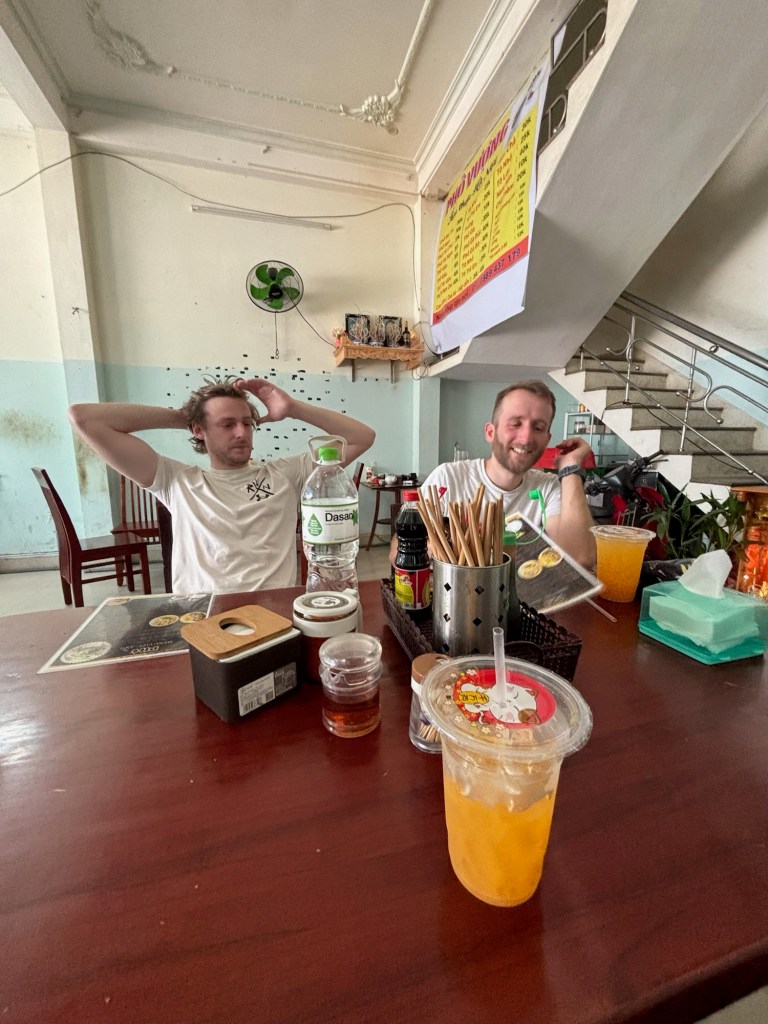 Le repas de ce midi sera un pho, parce que ça fait longtemps qu’on n’en a pas mangé et que c’est vraiment parfait en lendemain de soirée. Sur la route, nous prenons un jus de fruits pressés délicieux dans un boui-boui.