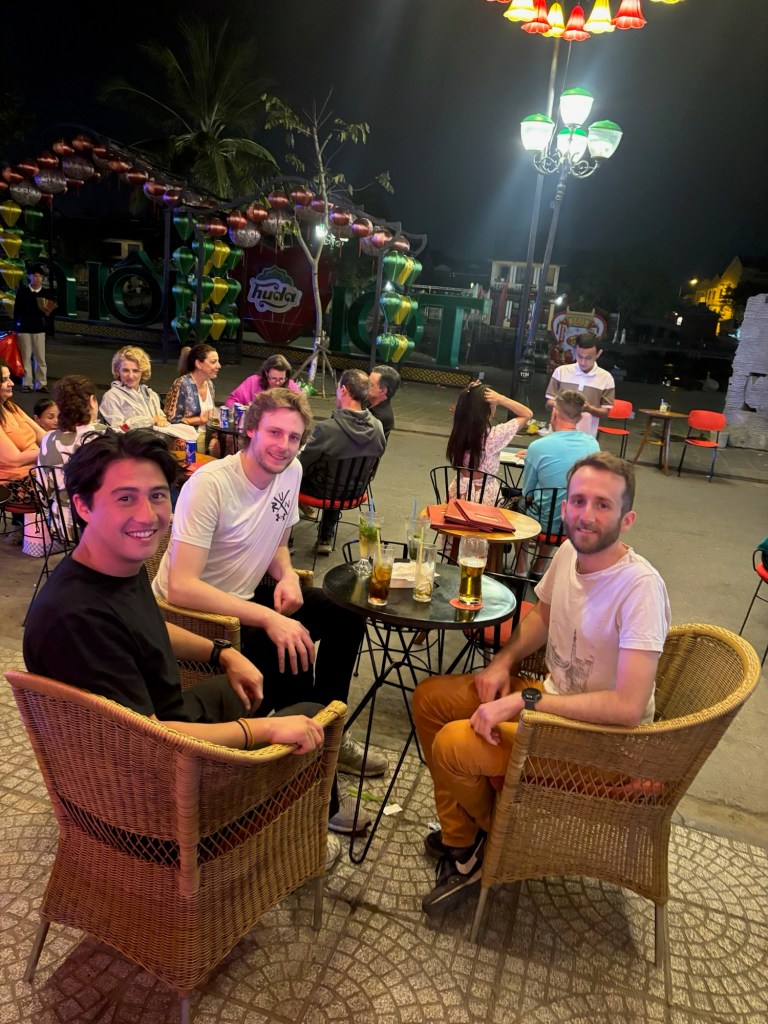 Une fois les assiettes vides, nous retournons dans la vieille ville de Hội An. Il y a toujours du monde mais l’ambiance a changé; peu à peu les barques viennent se garer proche des quais et le volume de la musique provenant des bars monte. En remontant la rue à pieds, on se fait accoster par une dizaine de rabatteurs qui proposent tous des happy hours plus avantageux les uns que les autres.