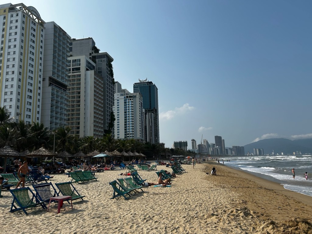 La route pour Hội An longe la côte et beaucoup de resorts ont été construits au bord de l’eau. Il y a aussi énormément d’immeubles géants dont la construction a été abandonnée : on ne voit que l’ossature en béton des immeubles. Aucune grue, aucun travailleur, aucun chantier n’est présent et pourrait laisser présager une reprise prochaine de la construction. Et il y en a des dizaines comme ça sur cette route. Nous retrouvons une urbanisation plus classique à mesure que nous approchons de Hội An.