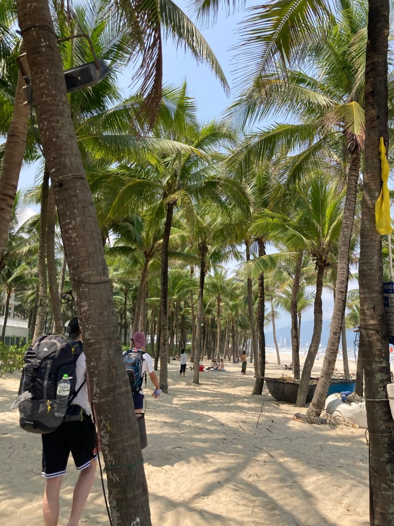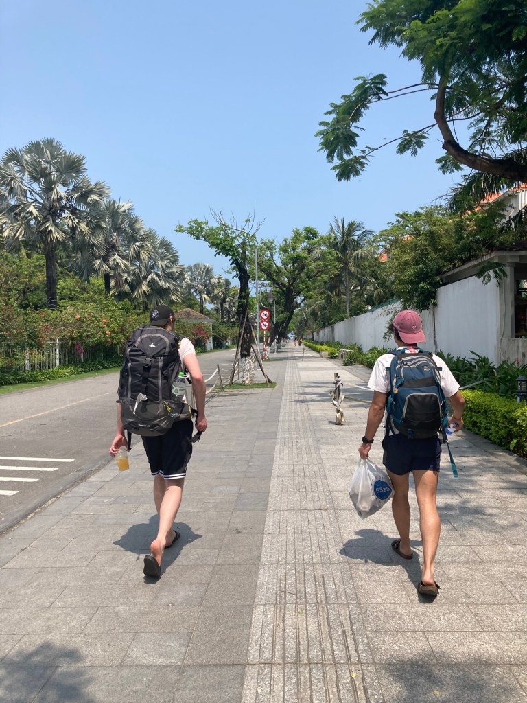 Loan se lève quelques minutes après que j’aie pris ma douche et annonce, vers 11h20 : « check-out dans 10 minutes les gars ». En réalité le check-out était prévu à 11h, on se retrouve donc quelque minutes plus tard avec nos grands sacs, dehors en plein soleil sans avoir eu le temps de se brosser les dents pour certains, prendre une douche pour d’autres.