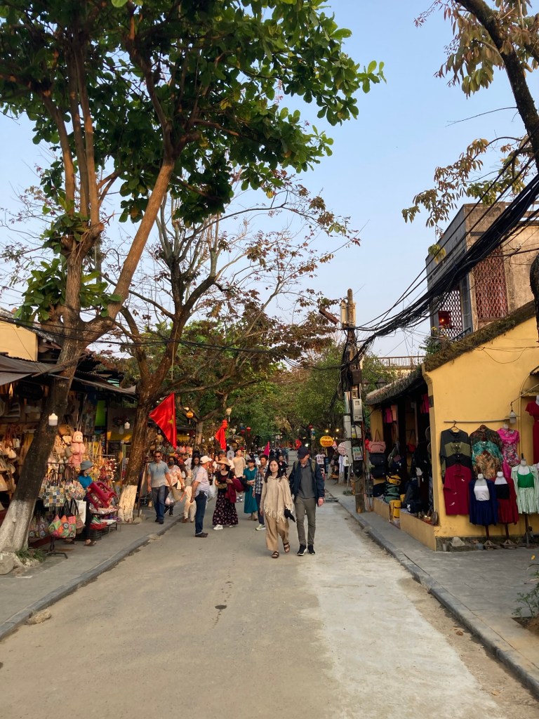 Après avoir rapidement déposé nos sacs dans l’Airbnb, nous approchons du centre-ville réservé aux piétons juste avant le coucher de soleil. Nous empruntons une première rue avec beaucoup de commerçants, artisans et restaurateurs. L’interdiction de circuler à scooter rend la circulation à pieds plus facile, des gardes veillant à faire respecter cette règle à grands coups de sifflet.