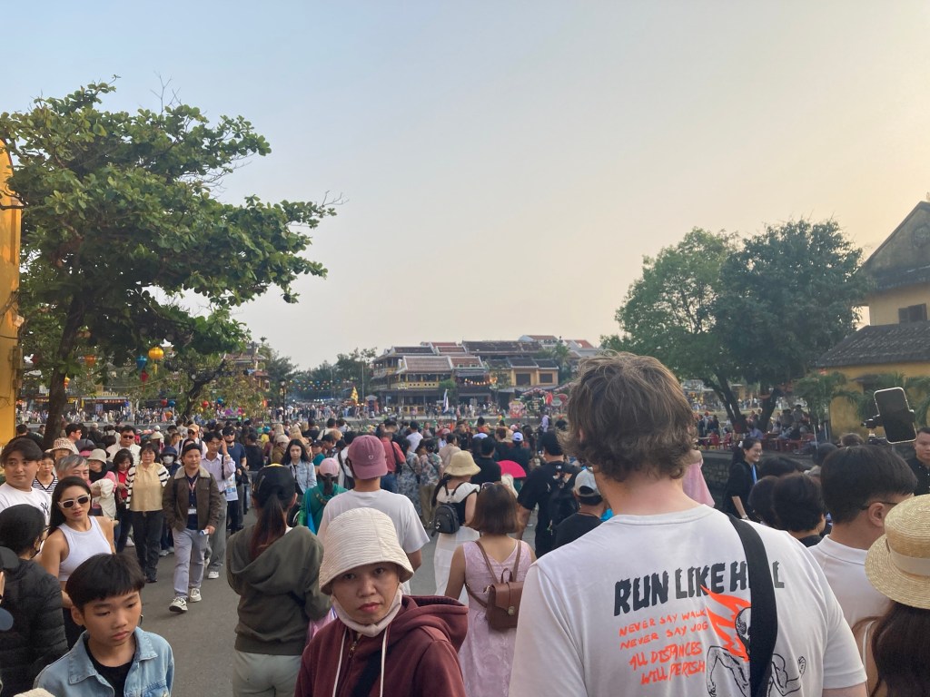 La vieille ville est bondée à cette heure : nous sommes samedi à 17h13 et les touristes venant du monde entier affluent autour de Thu Bồn River pour assister au défilé des barques éclairées par les lanternes typiques.