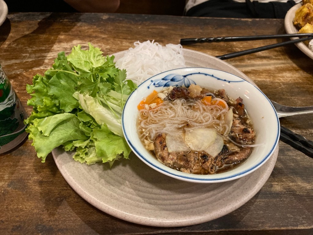Pour moi, ça sera Bún chả Hà Nội et du Bún bò trộn : le premier est une soupe de nouilles de riz avec du bœuf et des légumes, et le second est un mélange de nouilles de riz et de bœuf avec des oignons frits et des cacahuètes. C’est vraiment un régal.