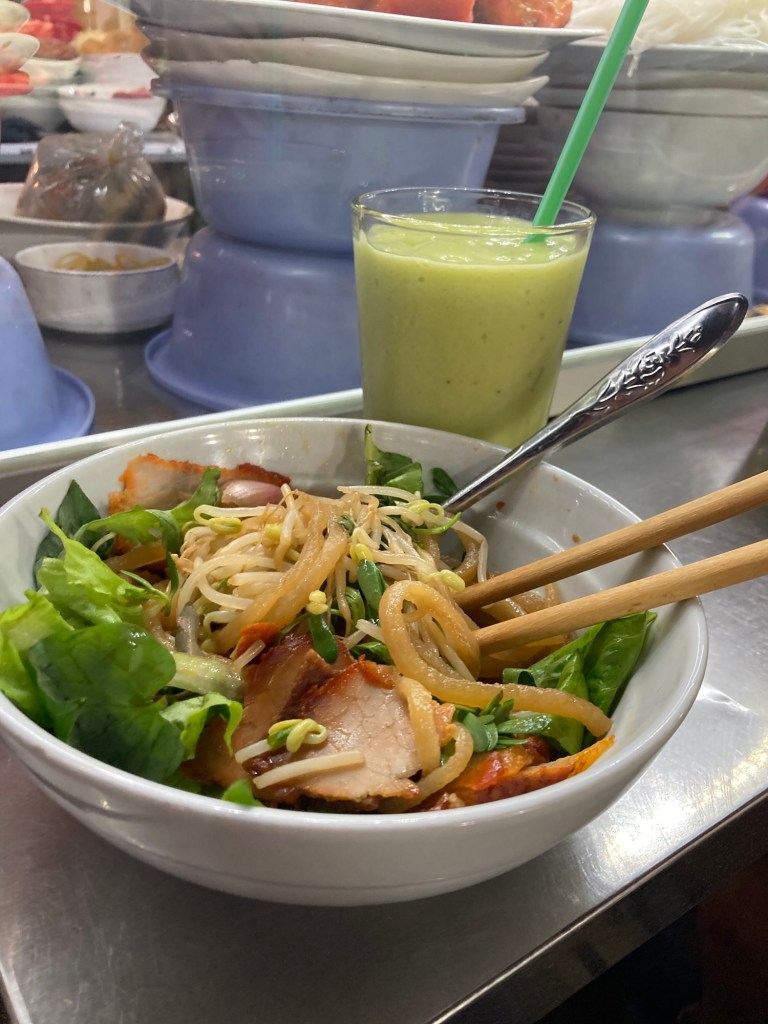 Notre route nous mĂšne au marchĂ© couvert. Dedans, ce sont en fait uniquement des petits restaus et vendeurs de boissons. Loan nous commande deux Cao Lau ainsi quâun pho pour Tony.